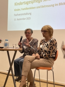 Im Anschluss erfolgte eine lebhafte Podiumsdiskussion, die sich mit der Frage beschäftigte:“ Welche Rahmenbedingungen in der Kindertagespflege eine Veränderung brauchen, damit Kindertagespflege auch in Zukunft ein attraktives Angebot bleibt?“ Die VertreterInnen aus Pädagogik, Politik und Praxis diskutierten unter anderem über die gesellschaftliche Anerkennung der Kindertagespflege als gleichrangiges Angebot zu anderen Betreuungssettings, über die Möglichkeiten und Grenzen von Vertretungsregelungen sowie die Notwendigkeit von Menschen, die sich in strukturellen Bereichen für die Kindertagespflege stark machen. Durch Wortbeiträge aus dem Publikum an verschiedenen Stellen konnte betont werden, dass Kindertagespflege ein Betreuungsangebot ist, welches Bindung und Resonanz für gesundes Aufwachsen bietet sowie anhand anschaulicher Beispiele aus dem Alltag die Möglichkeiten und Herausforderungen in der täglichen Arbeit skizziert werden.